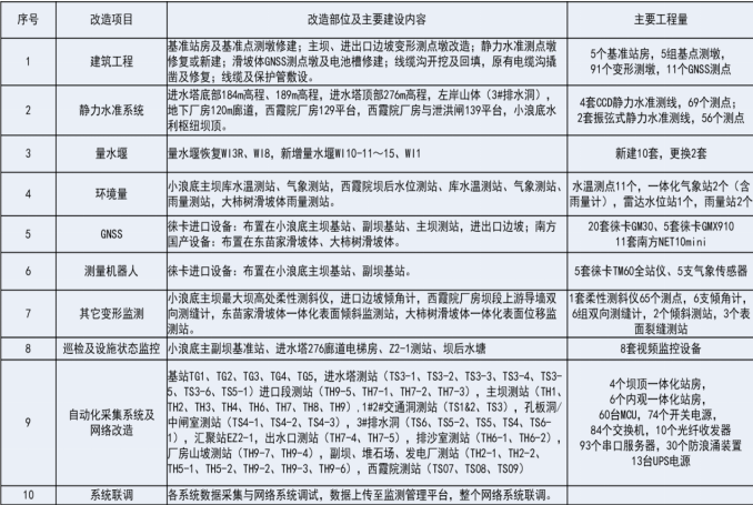 主要改造工作内容:对变形、渗流渗压、环境量等监测项目的完善、监测自动化系统的改造、巡检监控系统的完善、监测设施的改造、安全监测网络系统的改造以及与以上项目相关的土建建设。主要工程量如下表所列。